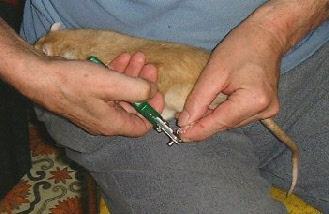 Do not grip a claw with the clippers because if he/she jerks suddenly the claw could be pulled out of the toe end, so set your aim, hold toe steady and clip the sharp tip off in one quick positive movement.